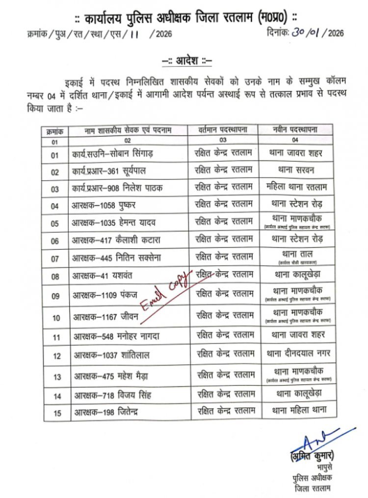 रतलाम एसपी ने रक्षित लाइन में पदस्थ 15 पुलिसकर्मियों की थानों और पुलिस चौकियों में पदस्थापना का आदेश जारी किया है।