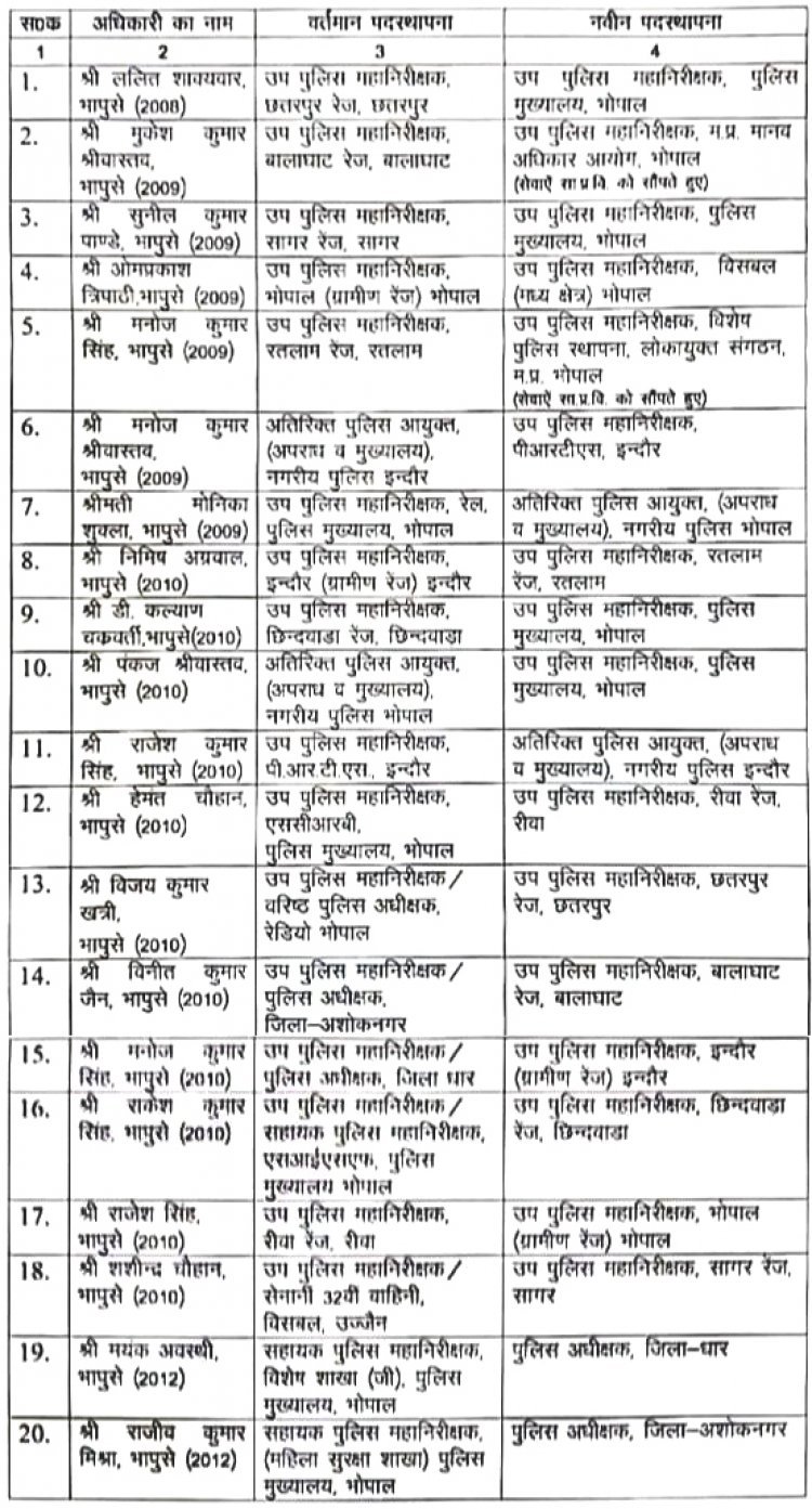 एसीएन टाइम्स @ भोपाल । मप्र के गृह विभाग ने प्रदेश के 20 आईपीएस अधिकारियों की तबादलरा सूची जारी की है। इससे प्रदेश के कई स्थानों के डीआई बदल गए हैं। अन्य पुलिस अधिकारियों की जिम्मेदारियां भी बदली हैं।