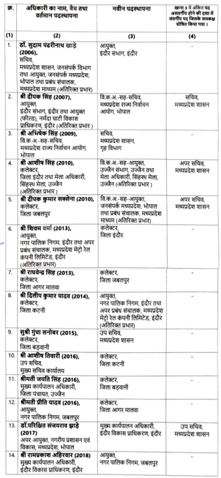 जारी सूची के अनुसार 2006 के आईएएस अधिकारी एवं जनसंपर्क विभाग के आयुक्त डॉ. सुदाम पंढरीनाथ खाड़े को इंदौर का संभागायुक्त बनाया गया है। वहीं उनके स्थान पर जबलपुर कलेक्टर दीपक कुमार सक्सेना को भेजा गया है। सक्सेना माध्यम का अतिरिक्त प्रभार भी संभालेंगे। इसी तरह अब 2009 बैच के अभिषेक सिंह प्रदेश के गृह सचिव की जिम्मेदारी संभालेंगे जो अभी तक मप्र राज्य निर्वाचन आयोग भोपाल में सह सचिव थे।
