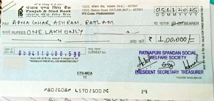 एसीएन टाइम्स @ रतलाम । सामाजिक सेवा के क्षेत्र में में अग्रणी संस्था ‘रत्नपुरी स्पंदन सोशल वेलफेयर सोसाइटी’ ने रतलाम के अपना घर आश्रम को 1 लाख रुपए की सहयोग राशि भेंट की। राशि संस्था के प्रतिनिधियों ने चेक के माध्यम से बेसहारा और निराश्रित 'प्रभु जी' (आश्रम में रहने वाले विपन्न और आश्रयहीन लोगों को दिया जाने वाला सम्मानजनक नाम) के हितार्थ प्रदान की।