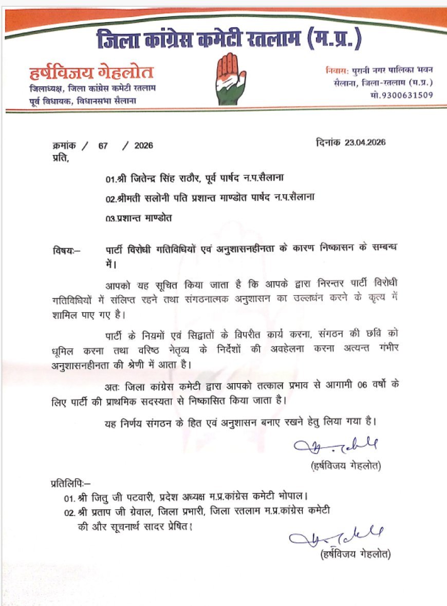 एसीएन टाइम्स @ रतलाम। जिला कांग्रेस कमेटी ने संगठनात्मक अनुशासन को लेकर सख्त रुख अपनाया है। जिला अध्यक्ष हर्षविजय गेहलोत ने सैलाना क्षेत्र के तीन नेताओं के खिलाफ बड़ी कार्रवाई की है। उन्होंने नगर परिषद सैलाना की पार्षद सलोनी मांडोत, पूर्व पार्षद जितेंद्र सिंह राठौर और प्रशांत मांडोत को पार्टी की प्राथमिक सदस्यता से छह वर्षों के लिए निष्कासित कर दिया है।