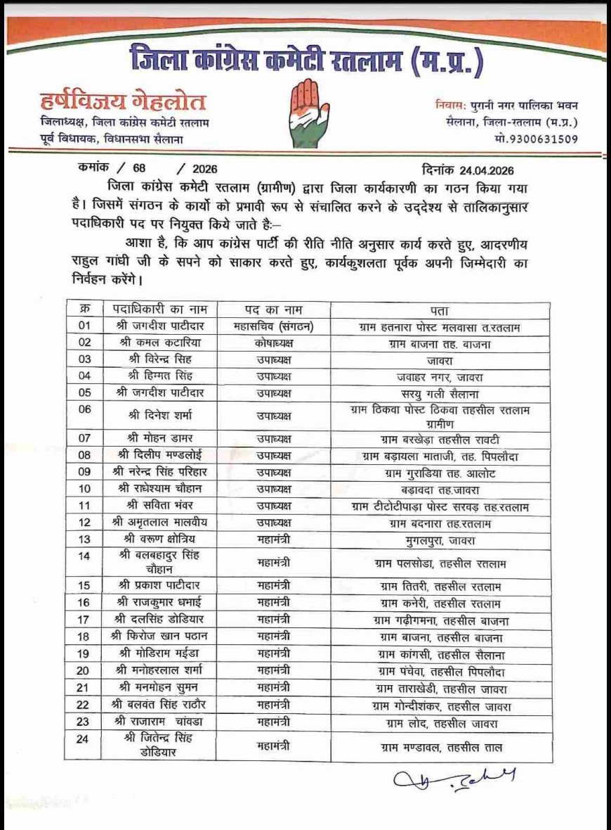 एसीएन टाइम्स @ रतलाम। आगामी 2027 के विधानसभा चुनावों के मद्देनजर जिला कांग्रेस कमेटी रतलाम (ग्रामीण) ने अपनी नई जिला कार्यकारिणी का ऐलान कर दिया है। जिलाध्यक्ष हर्षविजय गहलोत द्वारा जारी सूची में संगठन को बूथ स्तर तक मजबूत करने का स्पष्ट संदेश है। करीब 79 प्रमुख पदाधिकारियों की इस टीम में न केवल क्षेत्रीय संतुलन का ध्यान रखा गया है, बल्कि राहुल गांधी के विजन को साकार करने के लिए समर्पित कार्यकर्ताओं को तरजीह दी है। यह कार्यकारिणी महज एक सूची नहीं, बल्कि 2027 के रण के लिए कांग्रेस की वह अग्रिम पंक्ति है, जिसे रतलाम जिले, खासकर ग्रामीण अंचलों में पार्टी की जमीन वापस पाने की जिम्मेदारी सौंपी गई है।