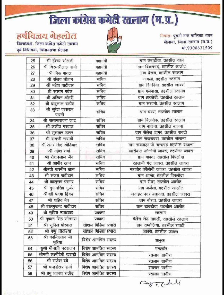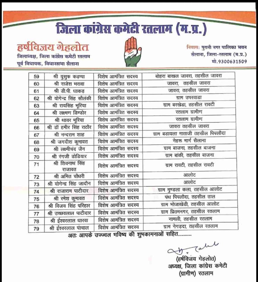 मिशन 2027 ! रतलाम जिला कांग्रेस की नई टीम घोषित, अध्यक्ष हर्षविजय गहलोत ने बिछाई बिसात, दिग्गजों को मिली विशेष आमंत्रितों में जगह