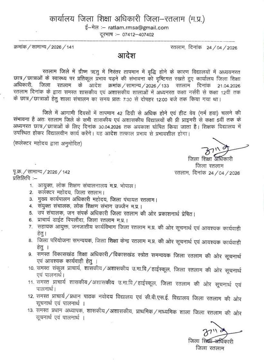 एसीएन टाइम्स @ रतलाम । जिले में लगातार बढ़ती गर्मी और लू के प्रभाव को देखते हुए प्रशासन ने स्कूली बच्चों को राहत देने का बड़ा निर्णय लिया है। रतलाम के जिला शिक्षा अधिकारी द्वारा जारी आदेश के अनुसार कक्षा पहली से पांचवीं तक के विद्यार्थियों के लिए 30 अप्रैल 2026 तक अवकाश घोषित किया गया है। अन्य कक्षाओं के समय में भी बदलाव किया है।