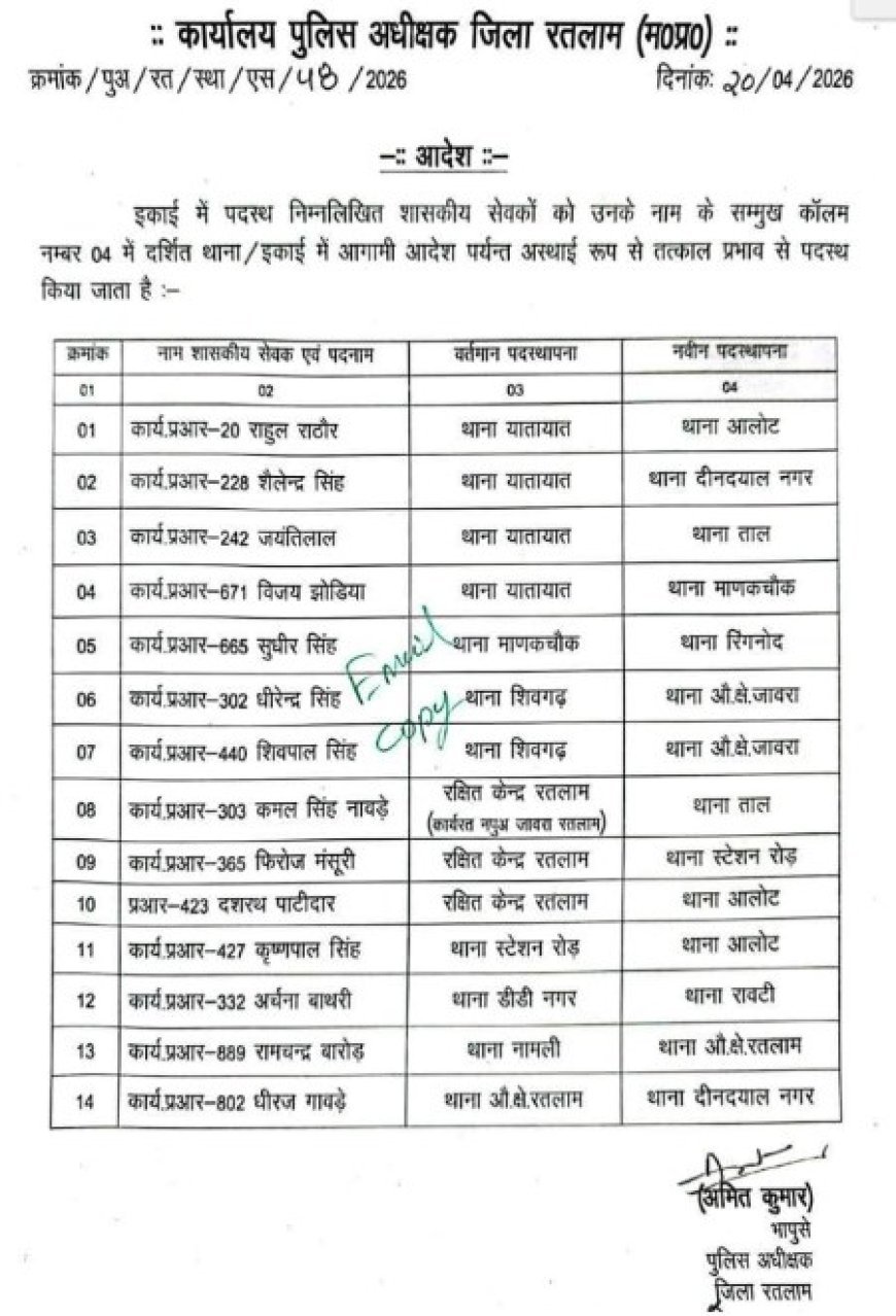 रतलाम एसपी अमित कुमार ने बड़ी कार्रवाई करते हुए माणकचौक थाना प्रभारी को लाइन अटैच करने के साथ ही 14 प्रधान आरक्षकों का तबादला भी कर दिया है। पढ़ें पूरी तबादला सूची।