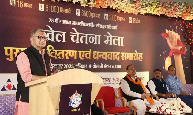 एसीएन टाइम्स @ रतलाम । क्रीड़ा भारती एवं चेतन्य काश्यप फाउण्डेशन द्वारा रजत जयंती वर्ष के अंतर्गत आयोजित 25वें खेल चेतना मेला का पुरस्कार वितरण एवं धन्यवाद समारोह फाउण्डेशन अध्यक्ष, क्रीड़ा भारती के राष्ट्रीय कार्याध्यक्ष एवं एमएसएमई मंत्री चेतन्य काश्यप की अध्यक्षता में संपन्न हुआ। इसमें शहर के विभिन्न स्कूलों की विजेता टीम एवं खिलाड़ियों को पुरस्कृत किया गया। विभिन्न खेल स्पर्धाओं में सर्वश्रेष्ठ स्कूल का पुरस्कार श्री गुरु तेग बहादुर एकेडमी को मिला। समारोह के विशेष अतिथि भाजपा संभाग प्रभारी सुरेश आर्य, जिलाध्यक्ष प्रदीप उपाध्याय, क्रीड़ा भारती जिलाध्यक्ष डॉ. गोपाल मजावदिया एवं खेल चेतना मेला आयोजन समिति सचिव मुकेश जैन मंचासीन रहे।