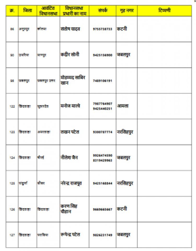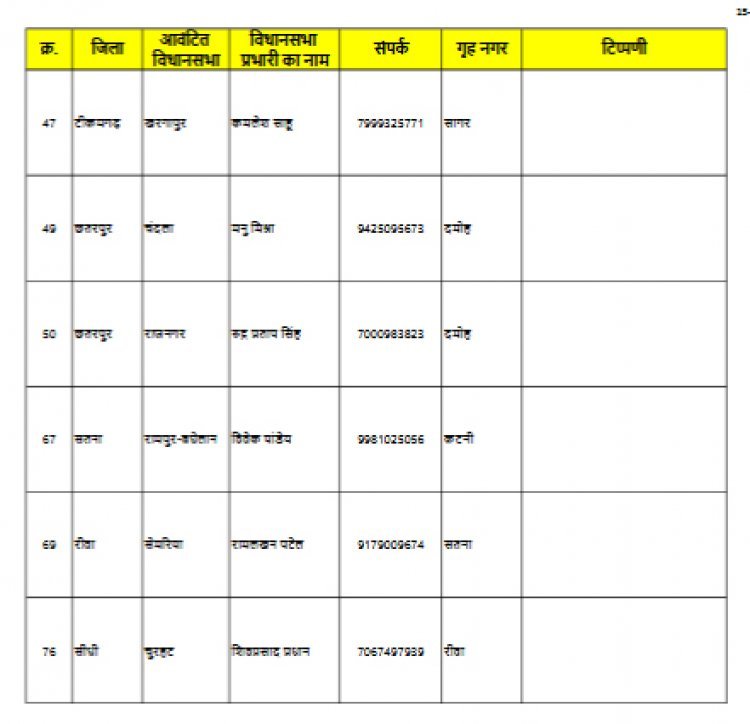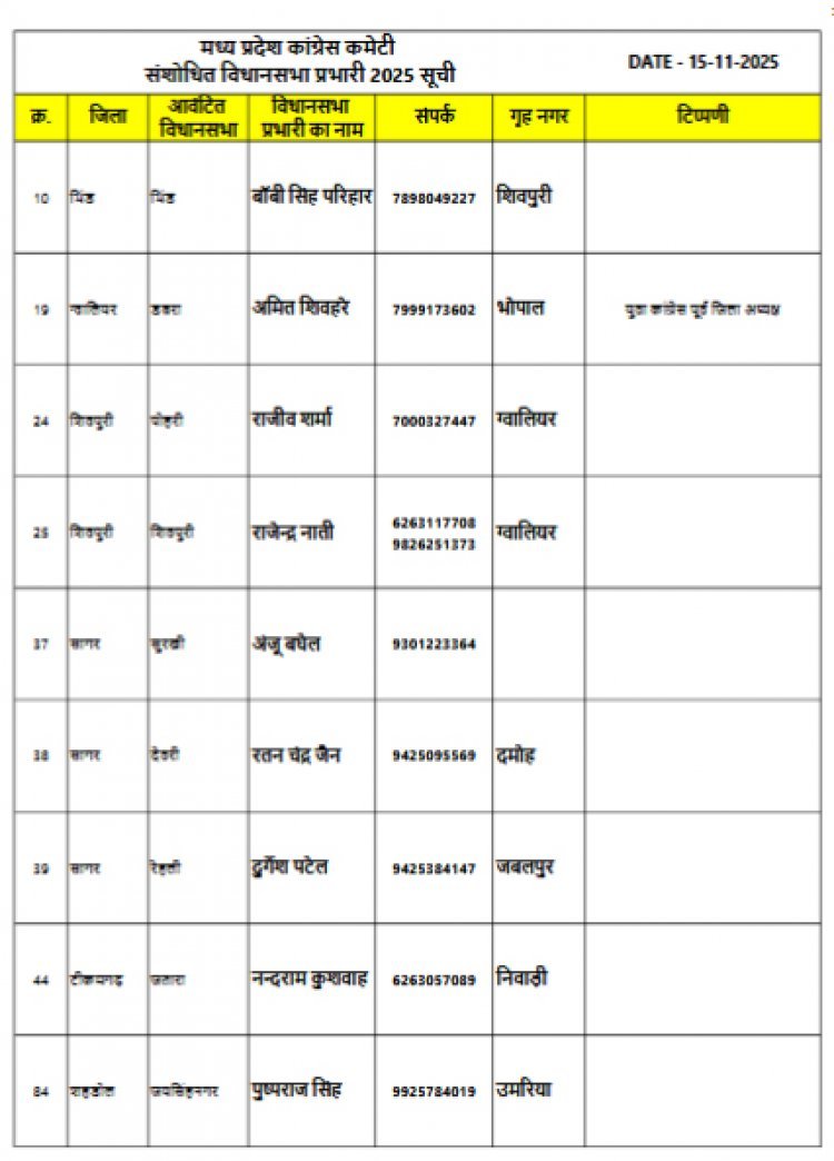 कांग्रेस के प्रदेश अध्यक्ष जीतू पटवारी द्वारा प्रदेश के 21 जिलों की 33 विधानसभा सीटों के प्रभारियों की संसोधित सूची जारी की है। सूची प्रदेश महामंत्री एवं संगठन प्रभारी डॉ. संजय कामले के हस्ताक्षर से जारी हुई है। एडवोकेट कपिल मजादिया के अनुसार संशोधित सूची में रतलाम के कांग्रेस नेता शैलेंद्र सिंह अठाना का नाम भी शामिल हैं। वे अब झाबुआ जिले की पेटलावद विधानसभा सीट के प्रभारी होंगे।