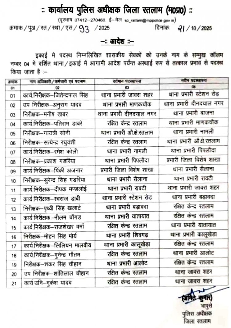 एसीएन टाइम्स @ रतलाम । अपराधों और अपराधियों पर ढीली पड़ती पुलिस की पकड़ को मजबूत करने के लिए एसपी अमित कुमार ने दीपावली मनते ही विभाग की बड़ी सर्जरी कर डाली। उन्होंने देर रात जिले के 19 टीआई सहित 21 पुलिस अधिकारियों की तबादला सूची जारी कर दी। जिले में पहली बार हुई ऐसी कार्रवाई से पूरे पुलिस महकमे में हड़कंप मच गया है। एसपी ने चार थाना प्रभारियों को लाइन हाजिर कर दिया तो कुछ को थाने की जिम्मेदारी देकर दीपावली का तोहफा भी दिया।