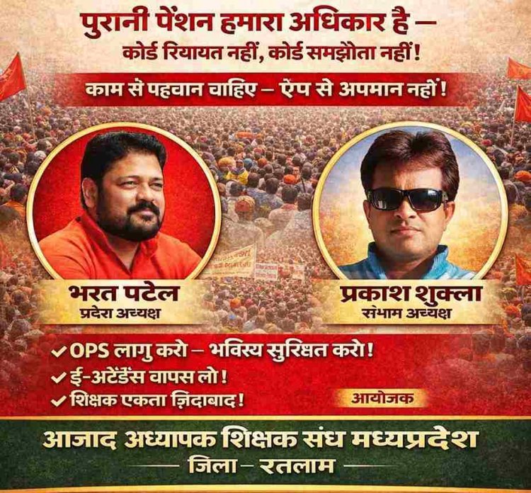 एसीएन टाइम्स @ रतलाम । अध्यापक शिक्षक संवर्ग की विभिन्न लंबित मांगों को लेकर आजाद अध्यापक शिक्षक संघ रतलाम के तत्वावधान में 8 फरवरी (रविवार), 2026 को जिले के शिक्षक सड़कों पर उतरेंगे। यह आंदोलन प्रदेश अध्यक्ष भरत पटेल के आह्वान पर प्रदेशभर में एक साथ किया जा रहा है। इस दौरान शिक्षक वाहन रैली निकाल कर पुरानी पेंशन की बहाली, वरिष्ठा निर्धारण और ई-अटेंडेंस की व्यवस्था बंद करने सहित 21 सूत्री मांगों को लेकर सीएम के नाम कलेक्टर को ज्ञापन सौंपा जाएगा।