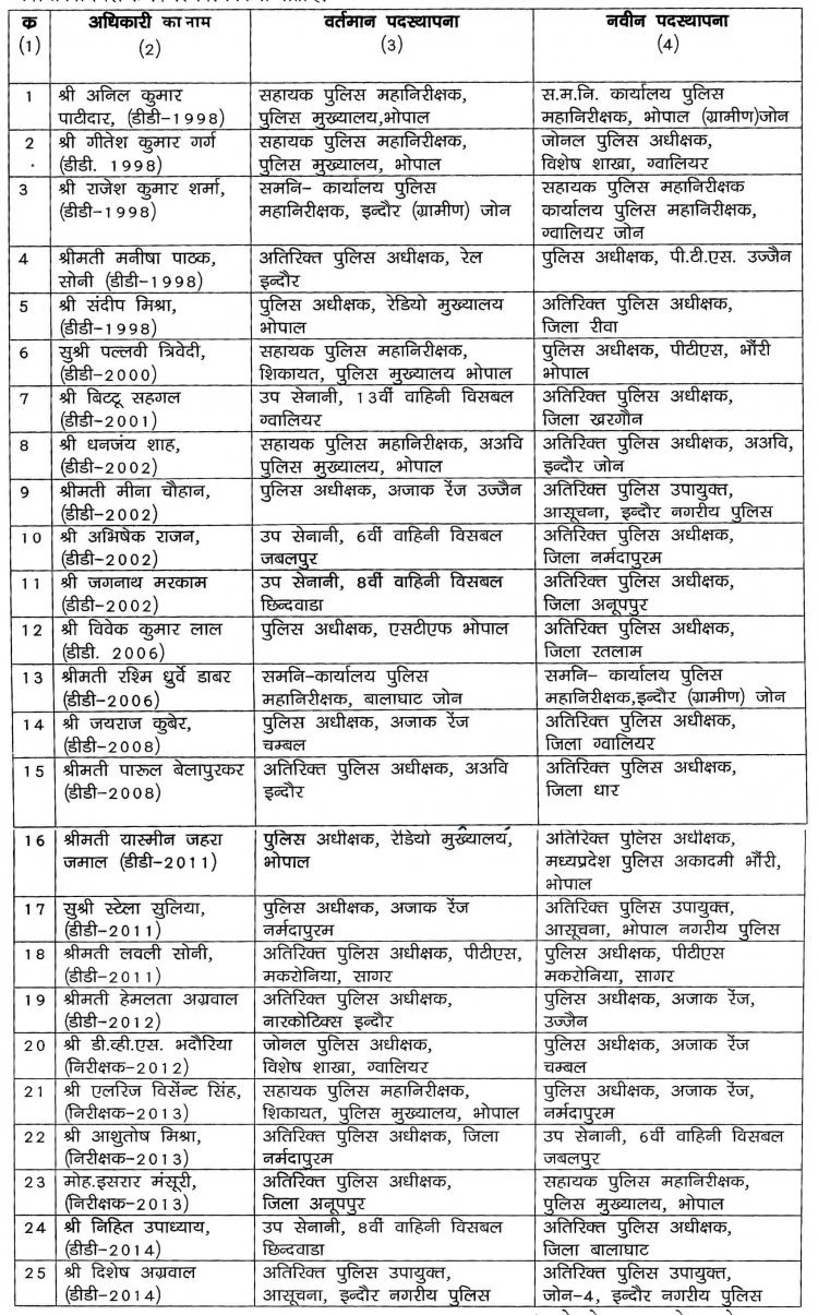 मध्यप्रदेश के गृह विभाग ने प्रदेश के 25 पुलिस अधिकारियों की तबादला सूची जारी की गई है। इसमें विभिन्न शाखाओं के एसपी, जिलों के एएसपी और सेनानी शामिल हैं।